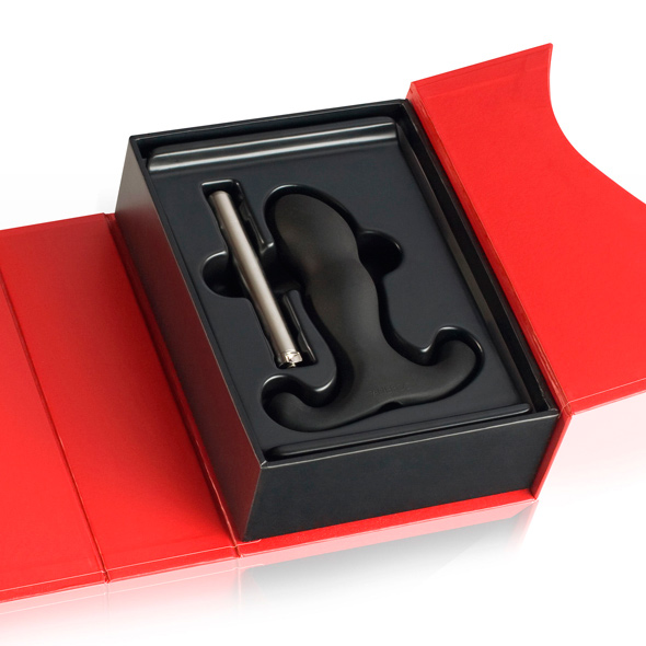 La llamativa caja de almacenamiento roja tiene una marca de agua con el logotipo de Aneros, pero solo es completamente visible cuando se mantiene en ángulo para su criterio. También tiene una caja magnética para garantizar que tu Vice se mantenga seguro en su interior.